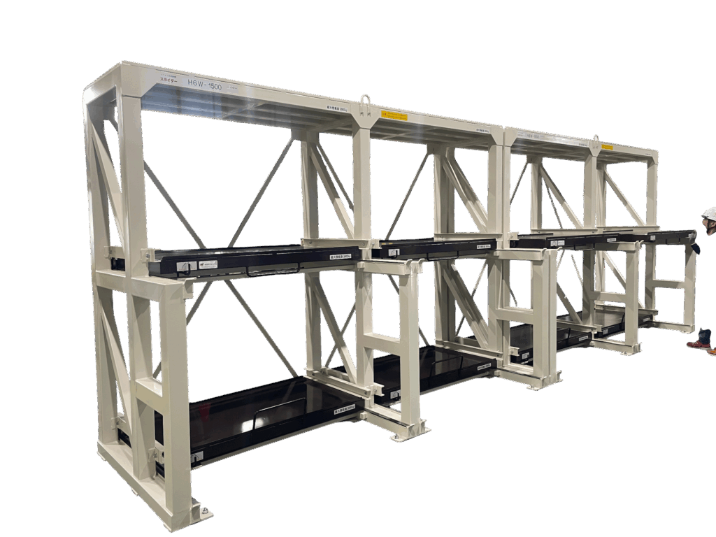 ・省スペース(立体的に保管)天井クレーンから直置きせずに棚に収納可能。・重量物であっても手動での引出し操作で可能です。(電気代等のランニングコスト不要・安全装置も二重に設計、自動ロック機構付きです。・現場での組立不要(溶接一体構造)