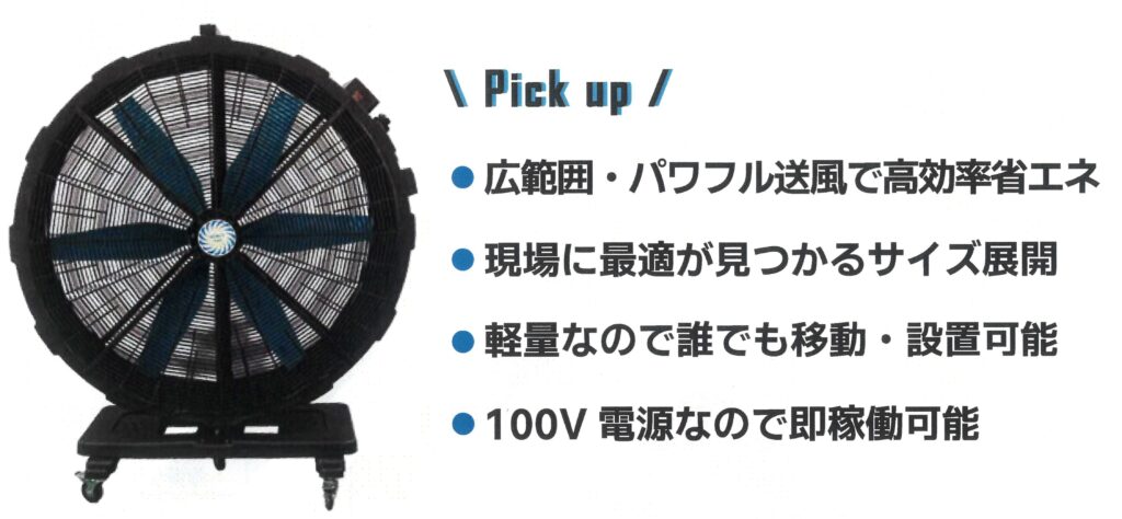 マテハンウインドシリーズは、工場・倉庫・作業現場における空気循環および換気効率の向上を目的とした業務用大型送風機です。樹脂ボディを採用することで軽量化を実現し、誰でも簡単に移動・設置が可能。100V電源対応により設置工事不要で、あらゆる現場ですぐに使用できます。広範囲にわたる送風性能により、効率的な空気環境の改善をサポートします。