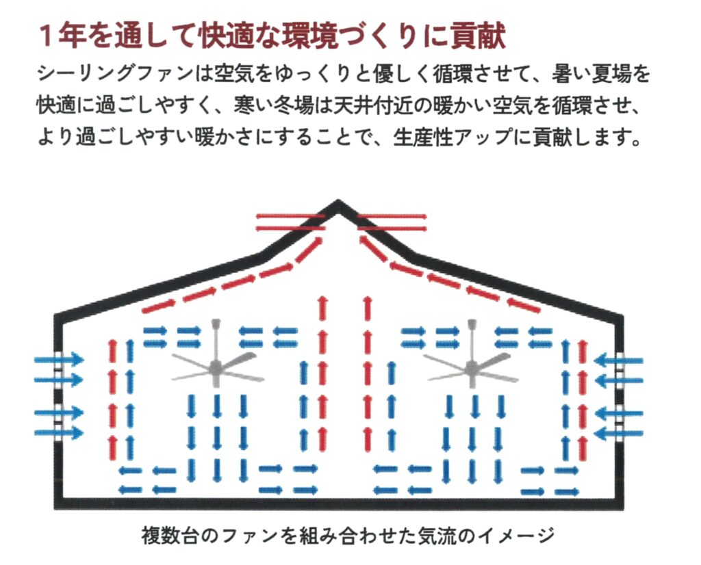 夏場は最大約25m先まで届く風により体感温度を最大-5℃低減し、熱中症リスクを軽減。冬場は天井付近に溜まった暖気を床面へ循環させ、室内温度のムラを解消します。これにより年間を通して快適な作業環境を実現し、生産性向上にも貢献します。